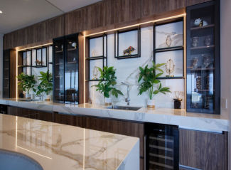 The villa comes with a fully equipped bespoke kitchen that features premium appliances and a sleek mini bar. A double-sided, built-in aquarium separates the lounge and dining areas.