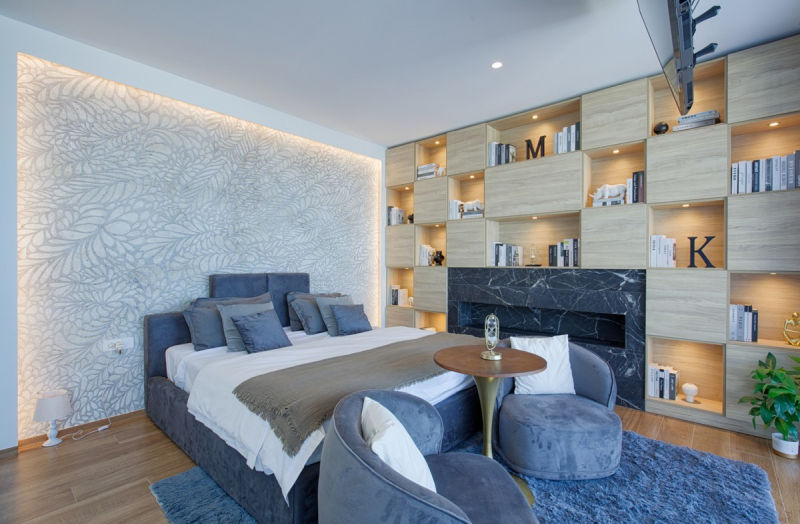 Upstairs, the master suite offers space and calm, with a freestanding tub positioned to face the sea. Built-in cabinets, modern finishes, and a luxurious bed complete the master bedroom. Downstairs, three additional guest bedrooms each have en-suite bathrooms, allowing for complete privacy for family or visitors. This floor also includes a large entertainment space, ideal for watching games, movies, or hosting friends.