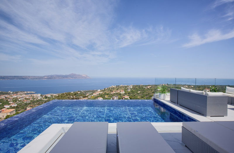 Located in Kokkino Chorio, West Crete this luxury villa is perched on a hillside, giving incredible views out to sea over Souda Bay and Akrotiri and the White Mountains.