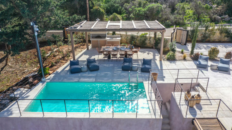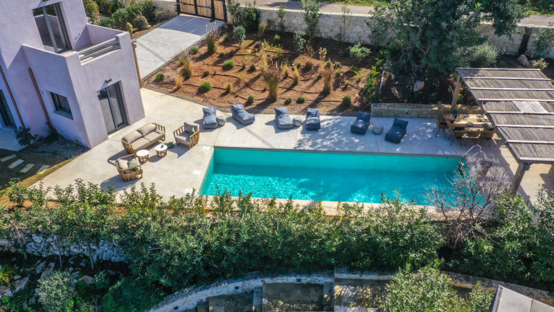 Just 900 meters from the historic heart of Gavalochori village, this exceptional hilltop property includes two fully independent modern villas, each designed with style, comfort, and privacy in mind. Surrounded by olive groves and nature, the homes offer uninterrupted views of the sea, White Mountains, and Cretan countryside.